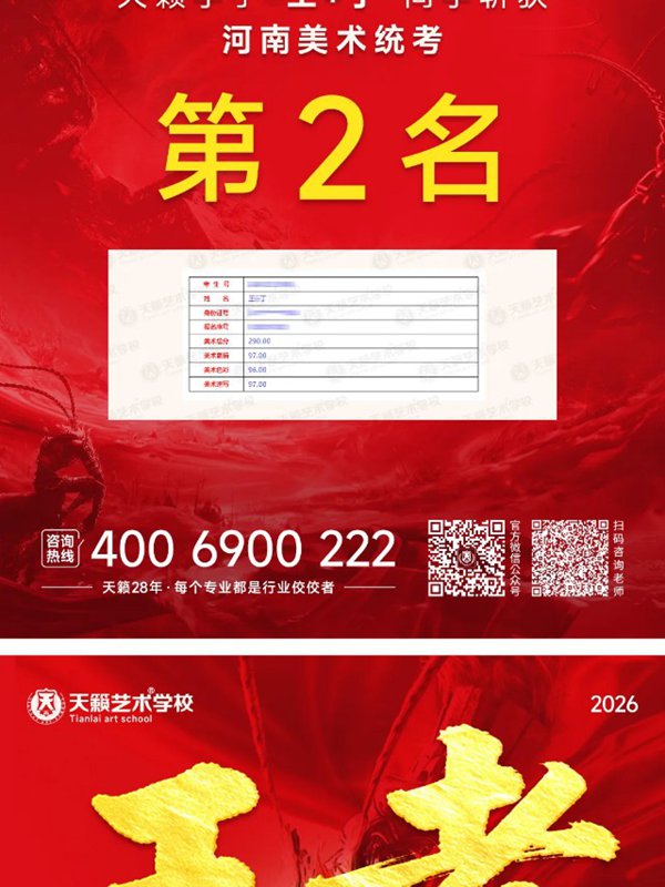 王*丁同学斩获2026河南美术统考第2名