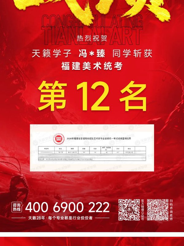 冯*臻同学斩获2026福建美术统考第12名