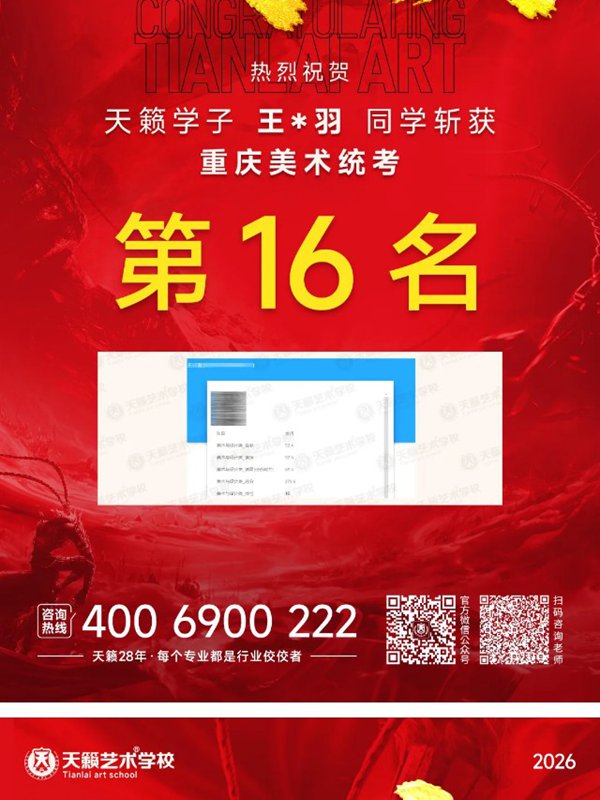 王*羽同学斩获2026重庆美术统考第16名